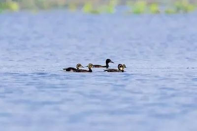 图片中,一只青头潜鸭雌性成鸭带着4只可爱的小鸭正在“闲庭信步”,它们行进中保持着一致的队形,形态十分可爱。