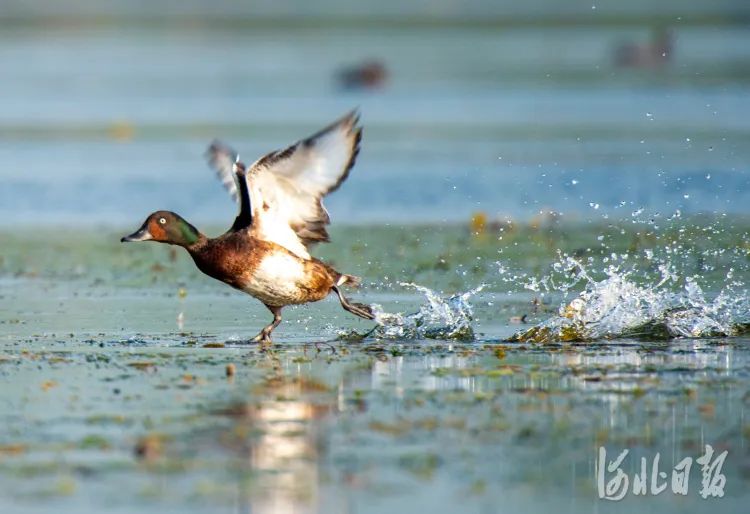 7月24日,在白洋淀水域,国家一级保护动物青头潜鸭在水面上栖息。河北日报记者李东宇摄