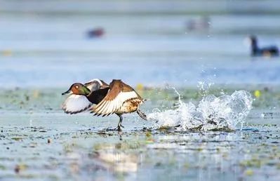 ▶2022年7月24日,白洋淀水域,青头潜鸭在水面上嬉戏。河北日报记者 李东宇摄