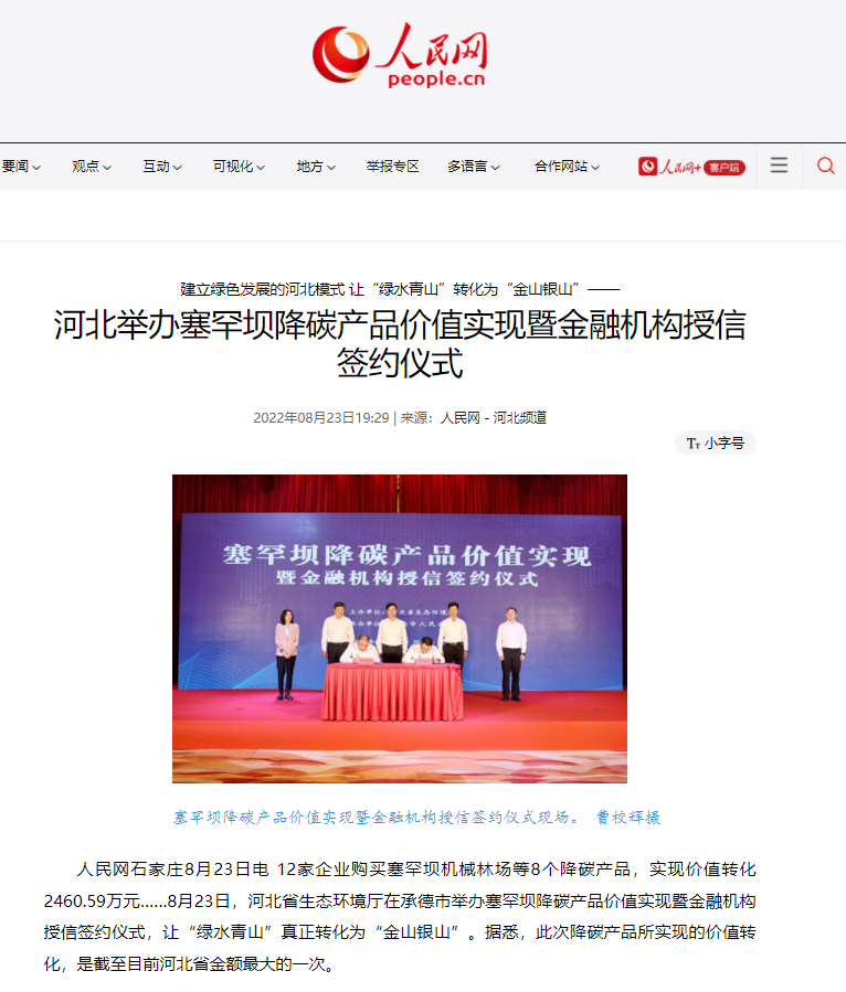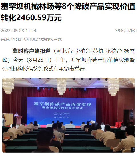 2022年8月23日,杏彩(中国)官方网站 在承德市举办塞罕坝降碳产品价值实现暨金融机构授信签约仪式。新华社、人民网、中国环境、河北日报、河北新闻联播、长城网、燕赵都市报、河北广播电视台冀时客户端等多家媒体相继对此次活动进行了报道。