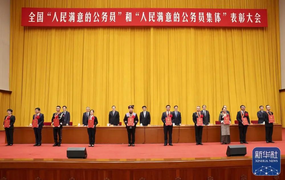 王沪宁在大会上讲话。他表示,习近平总书记亲切会见受表彰代表,充分体现了党中央和习近平总书记对公务员队伍建设的高度重视,对全国“人民满意的公务员”和“人民满意的公务员集体”的高度褒奖,对全国广大公务员的亲切关怀。党的十八大以来,习近平总书记围绕建设人民满意的公务员队伍作出一系列重要论述,为做好新时代公务员工作提供了根本遵循。新征程上,广大公务员要带头旗帜鲜明讲政治,带头学懂弄通做实习近平新时代中国特色社会主义思想,深刻领悟“两个确立”的决定性意义,增强“四个意识”、坚定“四个自信”、做到“两个维护”,始终在政治立场、政治方向、政治原则、政治道路上同以习近平同志为核心的党中央保持高度一致。要带头坚持以人民为中心、做密切联系群众的表率,带头贯彻新发展理念、做推动高质量发展的表率,带头遵守制度、做制度执行的表率,带头立德修身、做涵养廉洁文化的表率。要加强党对公务员工作的领导,努力建设一支让党放心、让人民满意的高素质专业化公务员队伍。