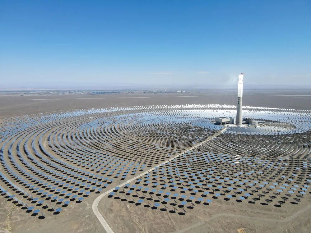 在新疆伊吾县淖毛湖镇拍摄的哈密50兆瓦熔盐塔式光热发电站(2021年8月22日摄,无人机照片)。作为新疆第一座光热发电站,哈密50兆瓦熔盐塔式光热发电站不仅污染物零排放,还通过储存热能实现24小时持续发电。新华社记者 高晗 摄