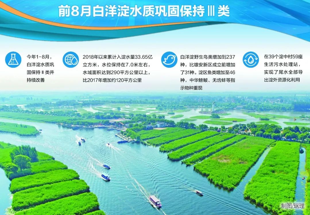 今年以来,白洋淀流域打出污染治理组合拳,推行无非清洁生产企业、入淀河流河岸两侧1千米范围内无新建扩建规模化畜禽养殖场、无面源管控盲区、无污水直排入河、无黑臭水体、无垃圾污水入淀“六无”标准,助力白洋淀水质继续稳定保持Ⅲ类并持续改善。