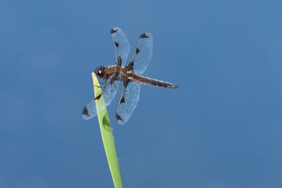 低斑蜻隶属于蜻蜓目蜻科蜻属,每年4—5月羽化为蜻蜓成虫,其余时间为生活在水中的稚虫。低斑蜻轻盈、秀气,薄如蝉翼的透明翅膀上分布着8个黑斑,使它能一眼就被辨认出来。