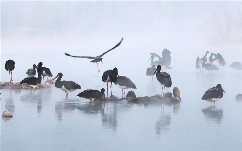 黑鹳是一种体态优美、体色鲜明、活动敏捷的大型涉禽,以鱼为主食,栖息于河流沿岸,是国家一级重点保护野生动物,被喻为鸟类中的“大熊猫”。