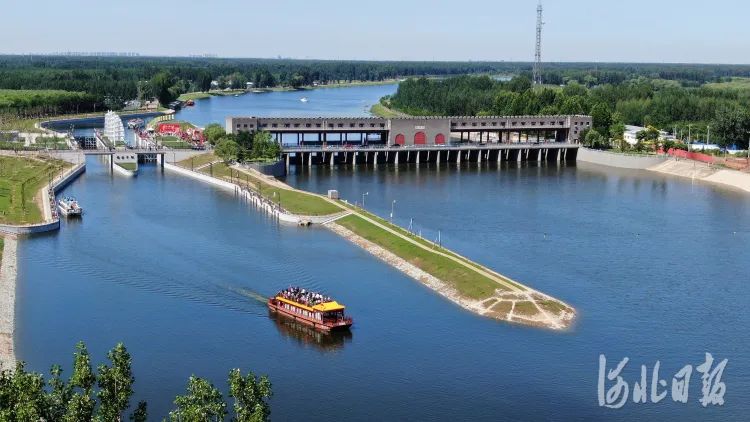2022年6月24日,北京通州游船通过杨洼闸,驶入河北廊坊香河段。当日,京冀北运河旅游航道实现互联互通。河北日报记者田明摄