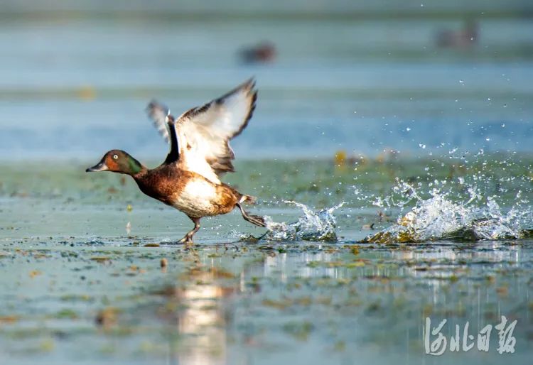 在白洋淀水域,国家一级保护动物青头潜鸭在水面上嬉戏。河北日报记者李东宇摄