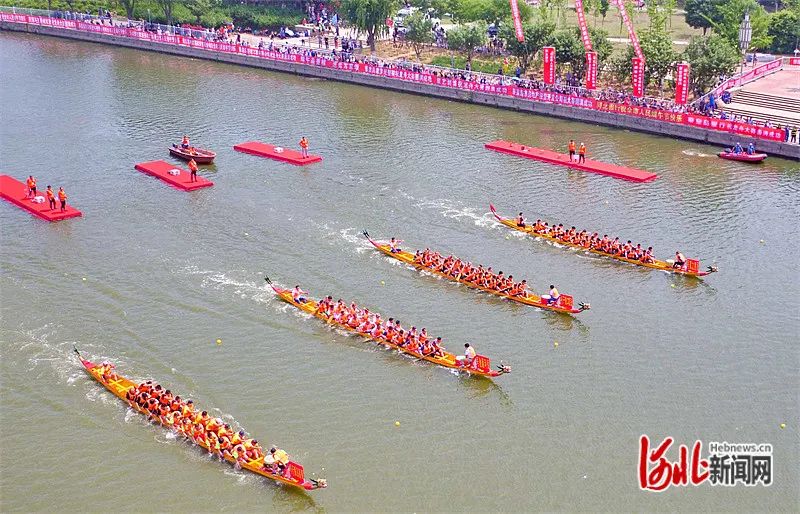在汤河上举办的龙舟比赛现场热闹非凡。