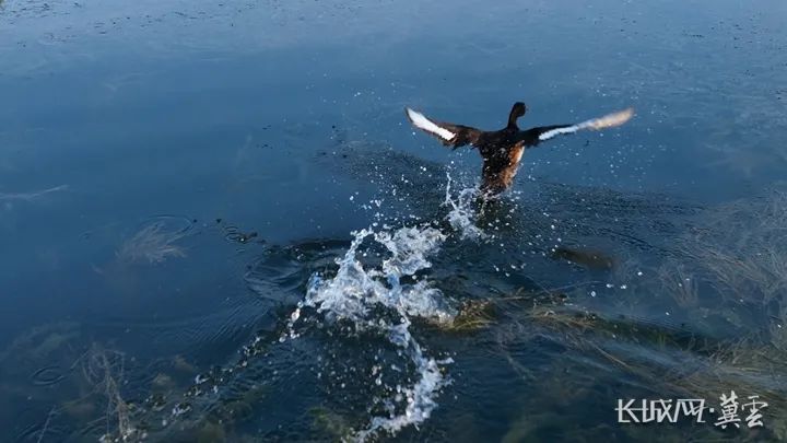 一只青头潜鸭在白洋淀水面上点水飞翔。长城网·冀云客户端记者 郑佳洵 摄