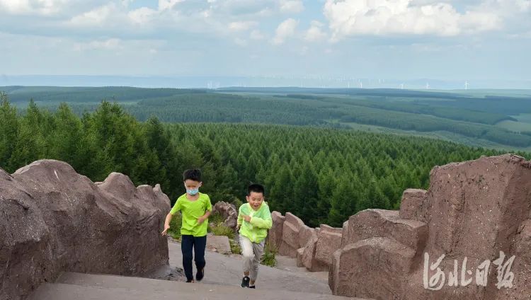 两名小朋友在美丽的塞罕坝游玩,他们身后就是一望无际的林海。河北日报记者赵杰摄