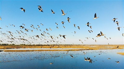 一湖碧水远泛花,群鸟纷飞戏涟漪。连日来,成群的越冬候鸟在衡水湖畔“集结”,或栖息觅食,或众鸟齐飞,上演“鸟浪”奇观。“每到春季和秋季候鸟迁徙高峰,大量鸭类和雁类开始锻炼体能,为迁徙做准备。随着衡水湖生态越变越好,这样的‘鸟浪’奇景如今在衡水湖并不鲜见。”常年在衡水湖护鸟的衡水滨湖新区综合执法局巡湖员李国忠说。