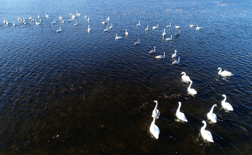 近日,一群天鹅在张家口市怀来县官厅水库国家湿地公园栖息。