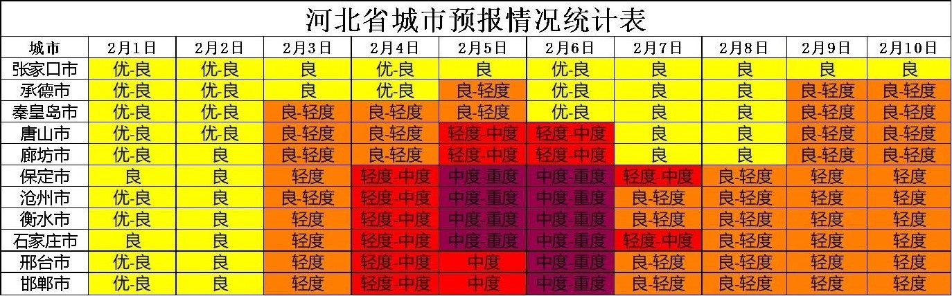 经河北省生态环境应急与重污染天气预警中心与中国环境监测总站、省气象灾害防御和环境气象中心联合会商,预计2023年2月上旬(1日~10日),期间4日~6日,我省处于冷空气间歇期,地面转南风影响,风力偏弱,湿度升高,扩散条件转差,污染累积,部分城市可能达到中度及以上污染水平。