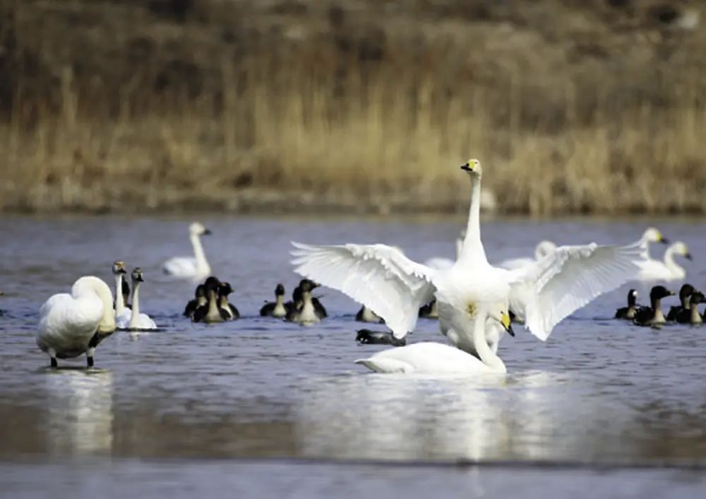 “根据观察,20只天鹅中共有15只大天鹅,其余为小天鹅,这些天鹅分属2个家庭,相处和谐。降落之后,它们马上开始欢快地洗澡,呼朋引伴进行觅食,河面水花四溅,热闹非凡。从毛色上看,这些大天鹅非常强壮,但是长途旅行还是让它们有些疲惫。”野生动物保护志愿者邢世杰告诉记者。