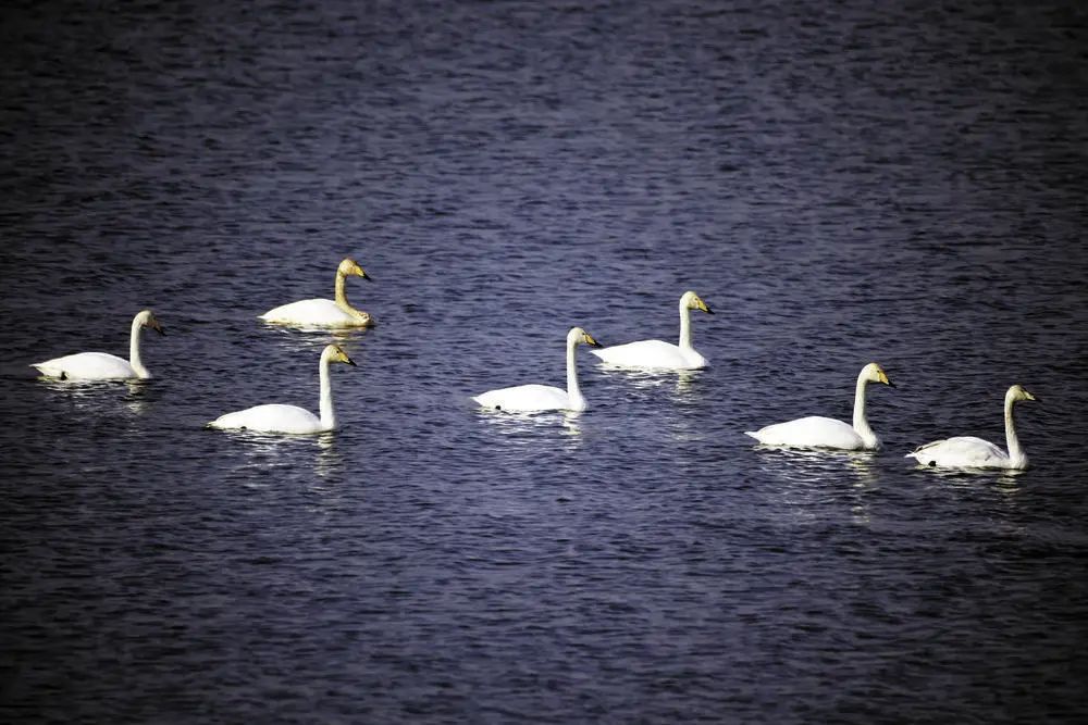 据了解,世界上总共有7种天鹅,分别是大天鹅、小天鹅、疣鼻天鹅、黑天鹅、黑颈天鹅、黑嘴天鹅及扁嘴天鹅。在我国能见到的野生天鹅有三种,分别是大天鹅、小天鹅和疣鼻天鹅。大天鹅与小天鹅的明显区别主要在嘴部的黄斑面积上,大天鹅比小天鹅的面积要大,上嘴黄斑延伸超过了鼻孔,嘴端呈黑色。