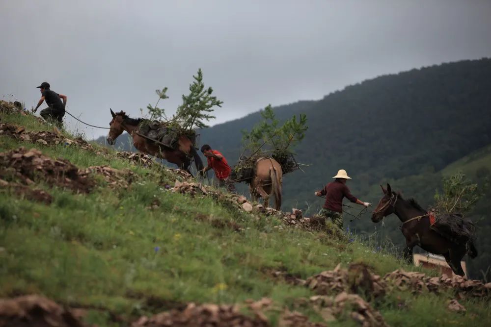 在承德丰宁满族自治县千松坝林场,群众将树苗运往山上。王立群 摄