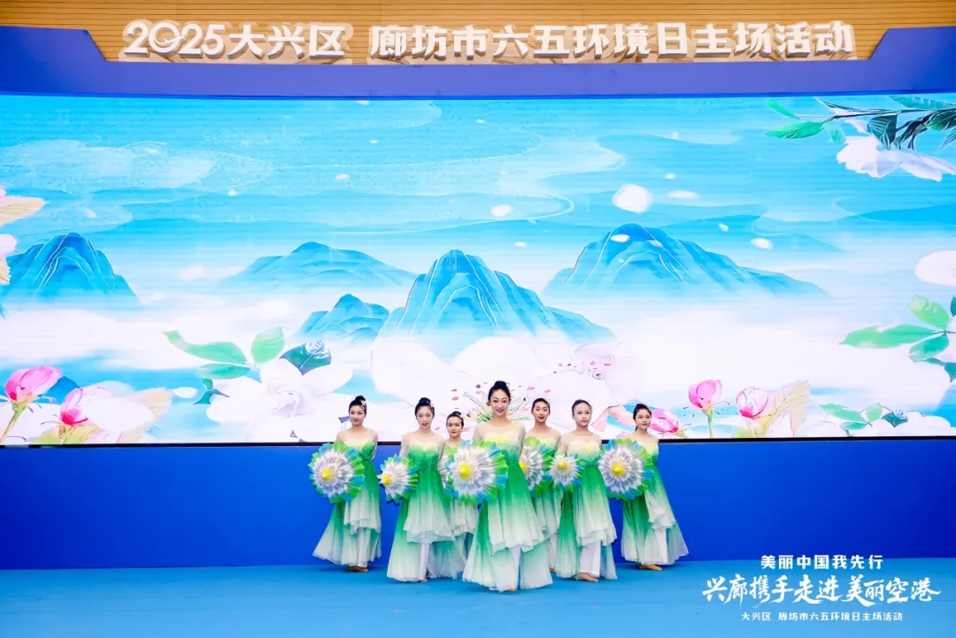 北京交通大学舞蹈团带来生态主题舞蹈《茉莉》,同学们以优美的舞姿展现自然之美,尽显风雅韵味;由大兴区生态环境局、廊坊市生态环境局共同发布“共建美丽空港”倡议,特邀双方市区领导和兴廊两地临空区管委会,共同推起象征“生态启航”的操纵杆,见证兴廊携手生态共建、发展共赢之旅正式启航。最后,两地生态环保铁军齐声高唱《环保人之歌》,“一片赤诚建设美丽中国”的歌词响彻云霄,展现出京冀共筑美丽中国的坚定信念,将活动气氛推向高潮。