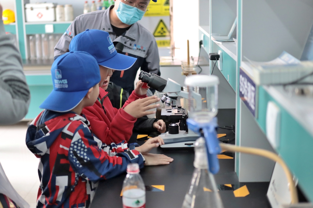 参观完污水处理厂的生产区域,大家来到了污水净化实验室,让小朋友们观察污水沉淀过滤,感受污水处理的变化过程。家长和小朋友们认真听讲、主动观察、积极发问,整个实验过程气氛活跃,小朋友们对污水处理过程印象也更加深刻。