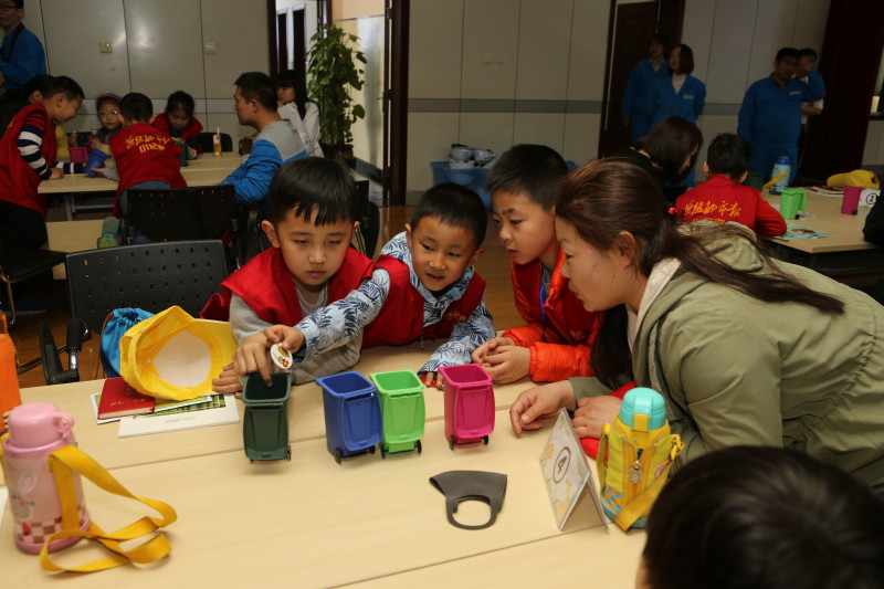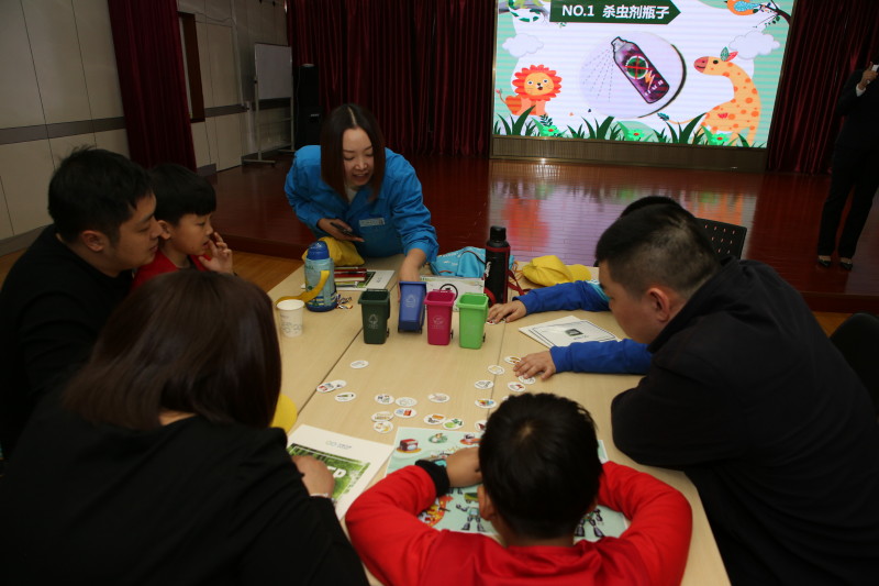 同时,为增强活动的深刻性和趣味性,我们在活动中设置了互动环节。“垃圾分类大比拼”游戏,小记者们用提前准备好的游戏卡片和迷你分类垃圾桶对垃圾分类进行模拟,各组家庭踊跃参与,热情高涨,纷纷争先抢后做游戏,通过游戏互动培养了家庭和孩子“垃圾分类,从我做起”的环境保护意识。