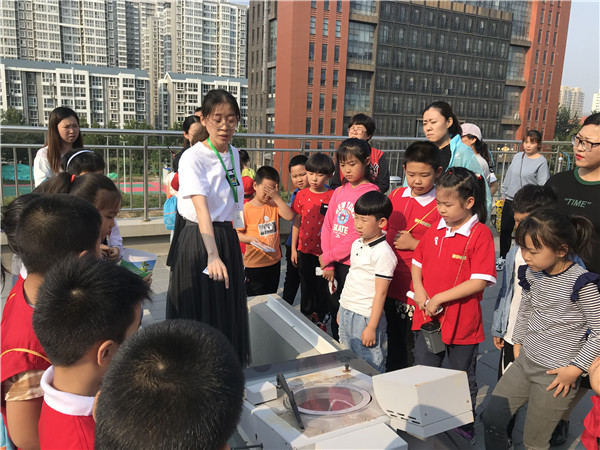 中心工作人员向参观者讲解激光雷达激光发射接收等相关工作原理