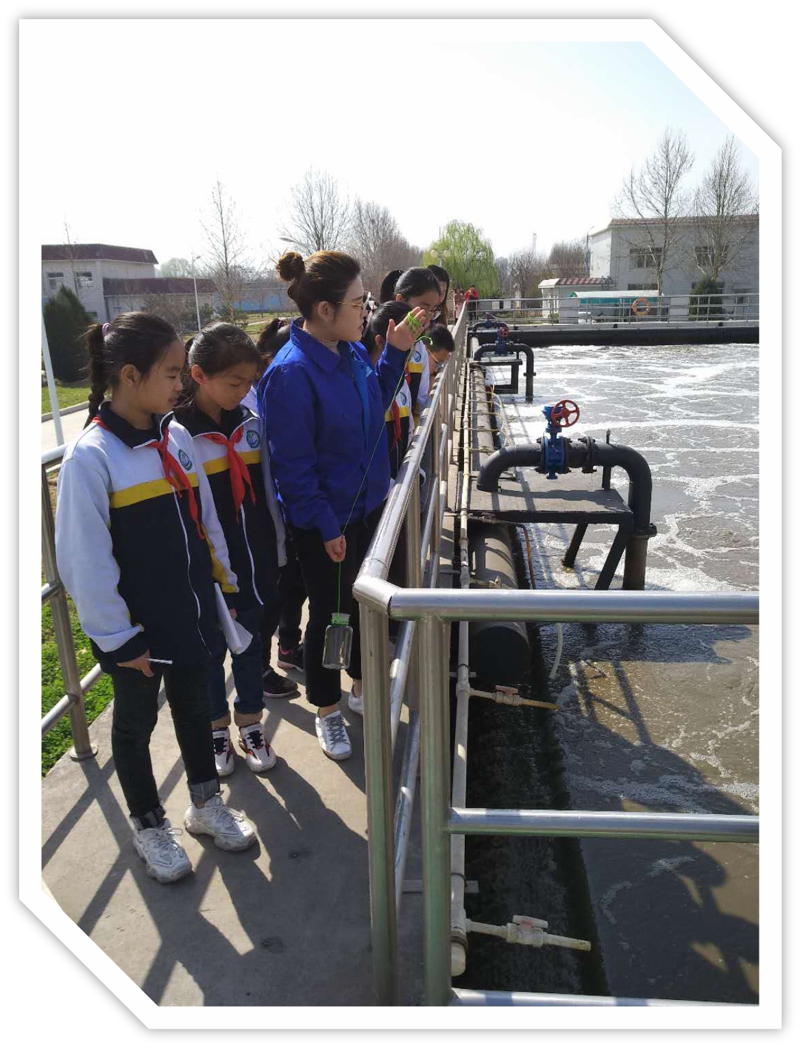 同学们队伍整齐,精神抖擞,第七中学的同学们还在“小手拉大手,红领巾助力环境治理保卫战”的横幅上庄重地签上自己的名字,表达自己保护环境的决心。随后,同学们在讲解人员和志愿者的带领下分成六组,对污水处理的过程进行了参观。为了让孩子们易于理解、印象深刻,我厂专门成立了讲解小组,通过形象的比喻把专业复杂的处理工艺变通为浅显易懂的语言,使孩子们对污水还清的过程有了更加直观的认识。大家忙着记录,时而提问,时而与讲解员进行交流,表现出了十足的好奇心,同时也有了一份沉甸甸的使命感。