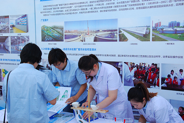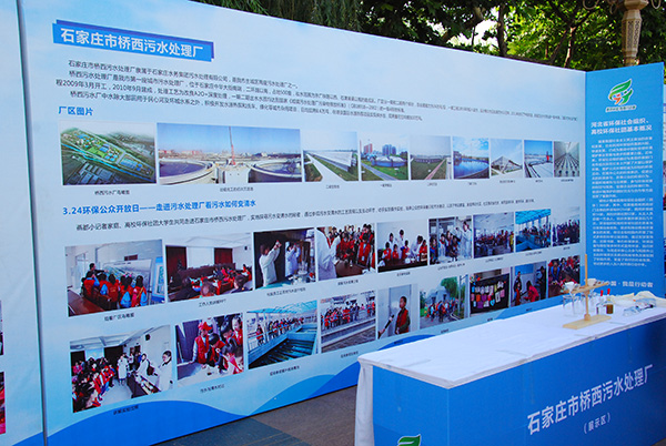 桥西污水处理厂组织干部职工参加了此次活动。活动开始时间为上午八点整,为了保证充分准备、以最好的状态迎接公众参观,参与活动的干部职工早上七点前就赶到了西清公园进行展台的布置和前期准备工作。活动中,工艺讲解员向公众分发资料册以及进行厂况、工艺的讲解;化验室的几名化验员为公众展示了污水变清水的实验—污泥絮凝实验,让公众直观的了解到污水处理的神奇。参观者对实验很感兴趣,也想进一步了解污水处理厂如何处理污水、处理后的水有哪些用途等问题。有一位老人家在听完讲解后说:以前没有想过污水处理这么复杂,回去要讲给家里的小孩子听,节约用水从孩子抓起。省环保厅领导也来到展台前参观垂询,并指出:污水处理利国利民,一定要履行好工作职责,确保达标排放。