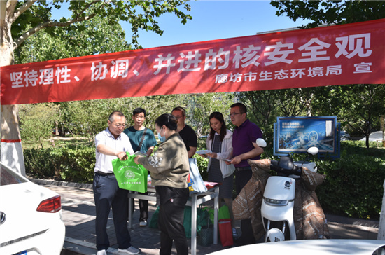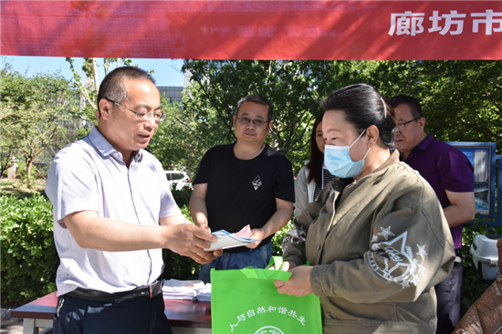 “山更青,水更绿,让中国更美丽,美丽的大自然是你我共同的家园······”。6月5日清晨,一曲悠扬动听的《让中国更美丽》在廊坊市生态环境局门前响起,宣传台前,市生态环境局的工作人员正耐心向过往市民解答问题。
