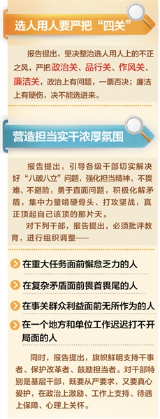 进一步推动干部轮岗交流、能上能下,报告提出,探索建立干部合理流动、调整退出的常态化机制。同时还明确,坚决整治选人用人上的不正之风,严把政治关、品行关、作风关、廉洁关,政治上有问题,一票否决;廉洁上有硬伤,决不能选进来。