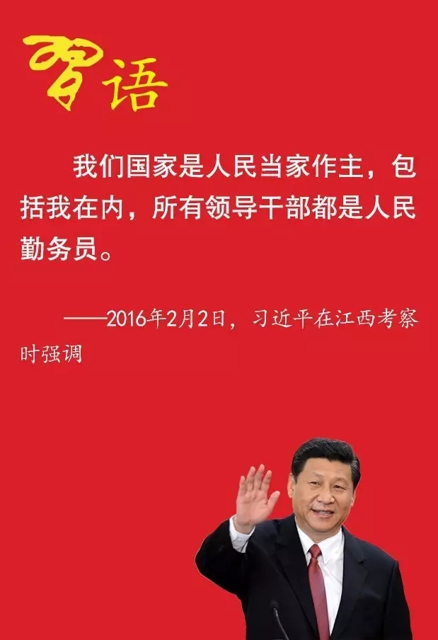2016年2月2日,习近平来到江西井冈山市茅坪乡神山村看望慰问基层干部群众。在贫困户张成德家中,习近平一间一间屋子察看,坐下来同夫妇俩算收入支出账,问家里种了什么、养了什么,吃穿住行还有什么困难和需求。老乡端上热气腾腾的米果请总书记品尝。女主人说,总书记给全国人民当家当得好,老百姓感到很幸福。习近平回应她说,我们国家是人民当家作主,包括我在内,所有领导干部都是人民勤务员。