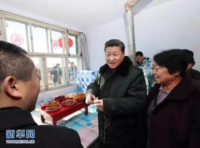 2017年1月24日,习近平来到河北省张家口市张北县,踏着皑皑白雪进入小二台镇德胜村。在村民徐万家,习近平问喝的用的水从哪里来,电视机啥时买的、能看多少频道,过年安排哪些活动。一家人你一言我一语作了回答,习近平听后说我这就放心了。看到家里摆的年货,习近平拿起油炸的“开口笑”品尝,说味道很好。