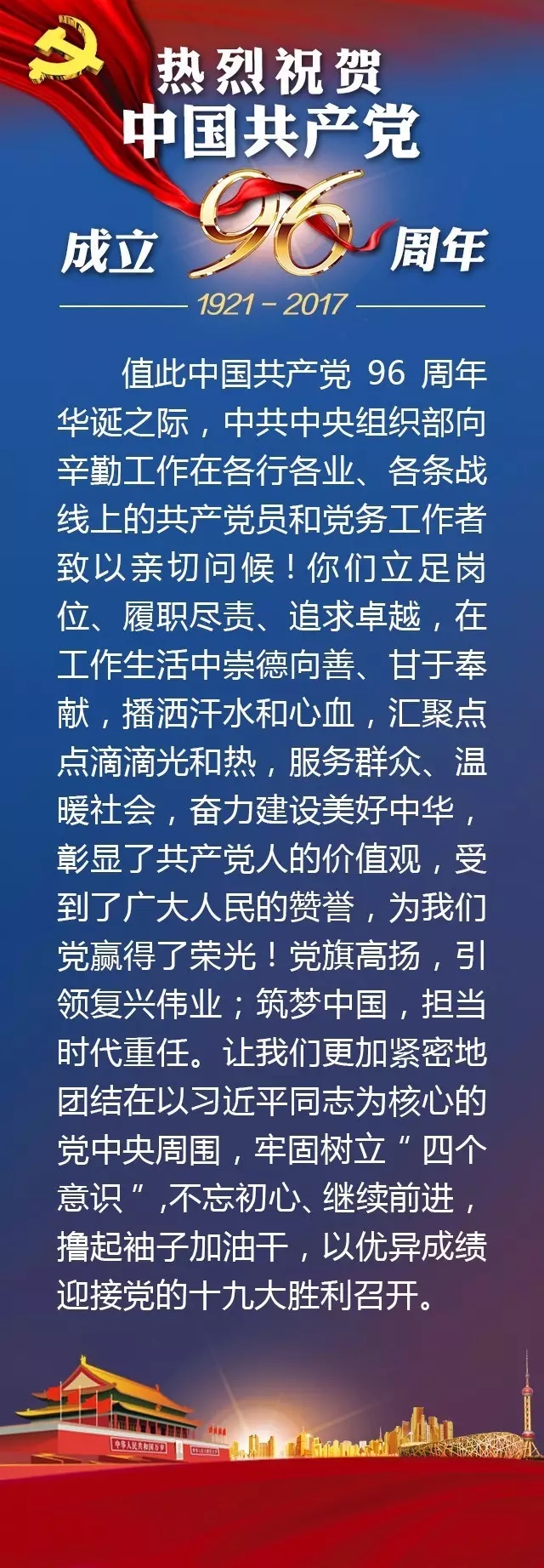 中央组织部向全国共产党员和党务工作者致以节日祝贺