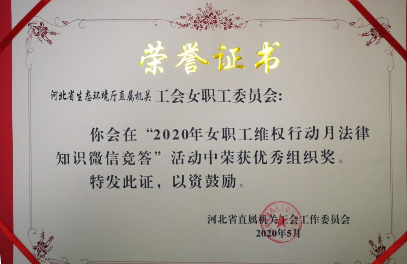 在第110个“三八”国际妇女节和第21个妇女维权周期间,杏彩(中国)官方网站 直属机关工会女职工委员会积极组织女职工参加“法润燕赵促平安·巾帼筑梦新时代”妇女维权法律知识微信竞答活动,利用微信群推送法律法规知识、交流学习心得,被省直属机关工会工作委员会评为2020年女职工维权行动月法律知识微信竞答活动优秀组织奖。
