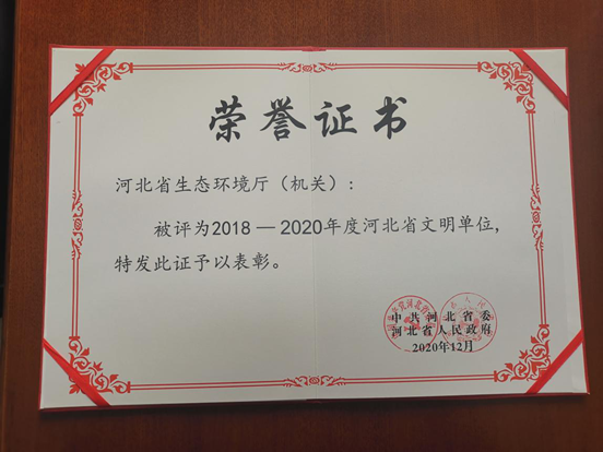 日前,河北省生态环境厅被中共河北省委、河北省人民政府授予“2018-2020年度河北省文明单位”称号。
