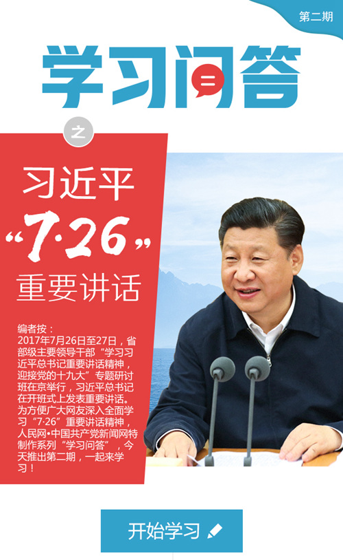 编者按:2017年7月26日至27日,省部级主要领导干部“学习习近平总书记重要讲话精神,迎接党的十九大”专题研讨班在京举行,习近平总书记在开班式上发表重要讲话。为方便广大网友深入全面学习“7·26”重要讲话精神,人民网·中国共产党新闻网特制作系列“学习问答”,今天推出第二期,一起来学习!