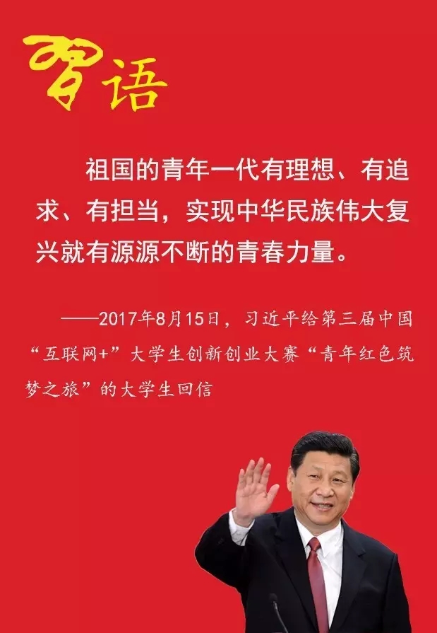 青年是国家和民族的希望,创新是社会进步的灵魂,创业是推动经济社会发展、改善民生的重要途径。青年学生富有想象力和创造力,是创新创业的有生力量。希望广大青年学生把自己的人生追求同国家发展进步、人民伟大实践紧密结合起来,刻苦学习,脚踏实地,锐意进取,在创新创业中展示才华、服务社会。