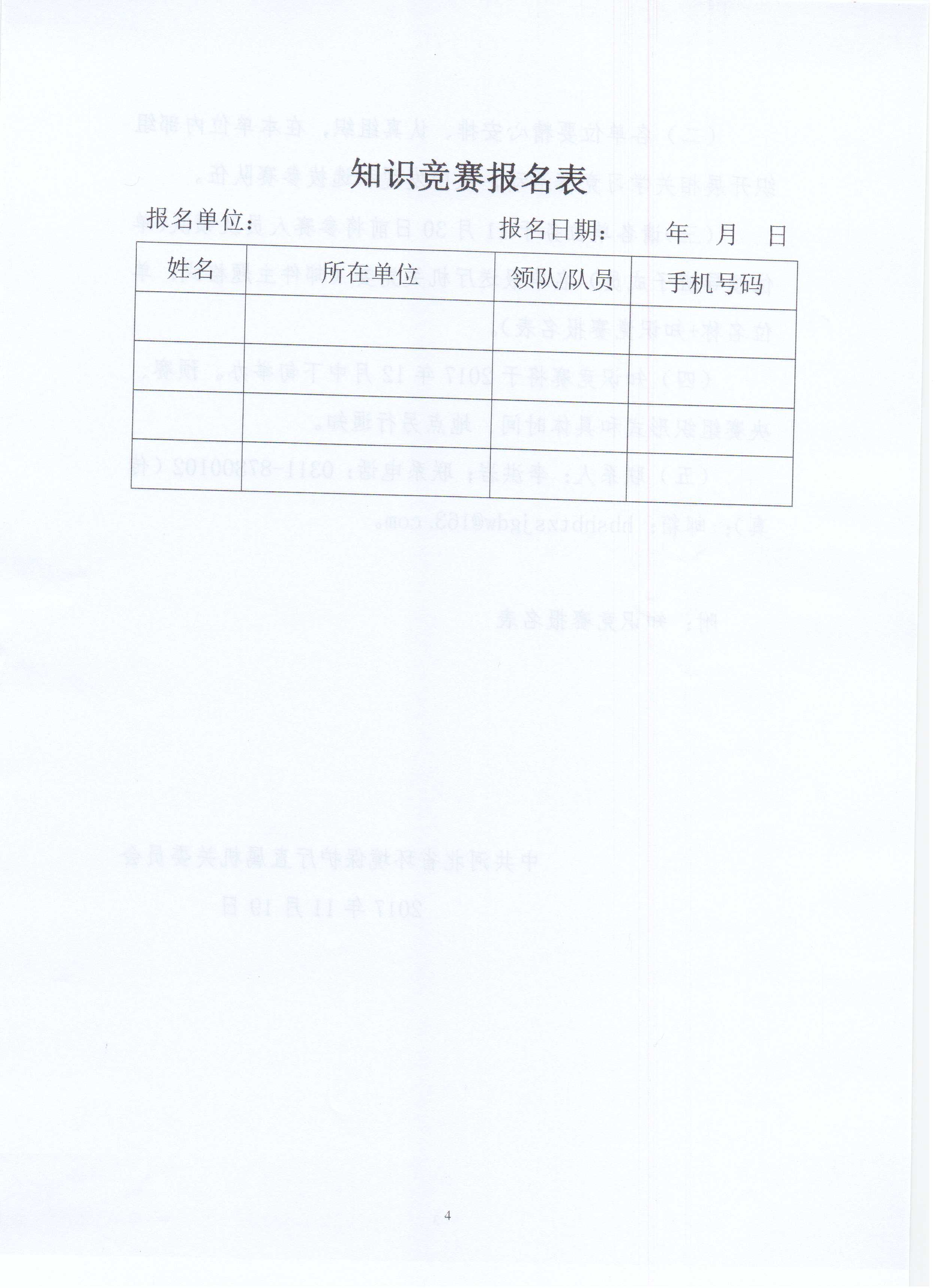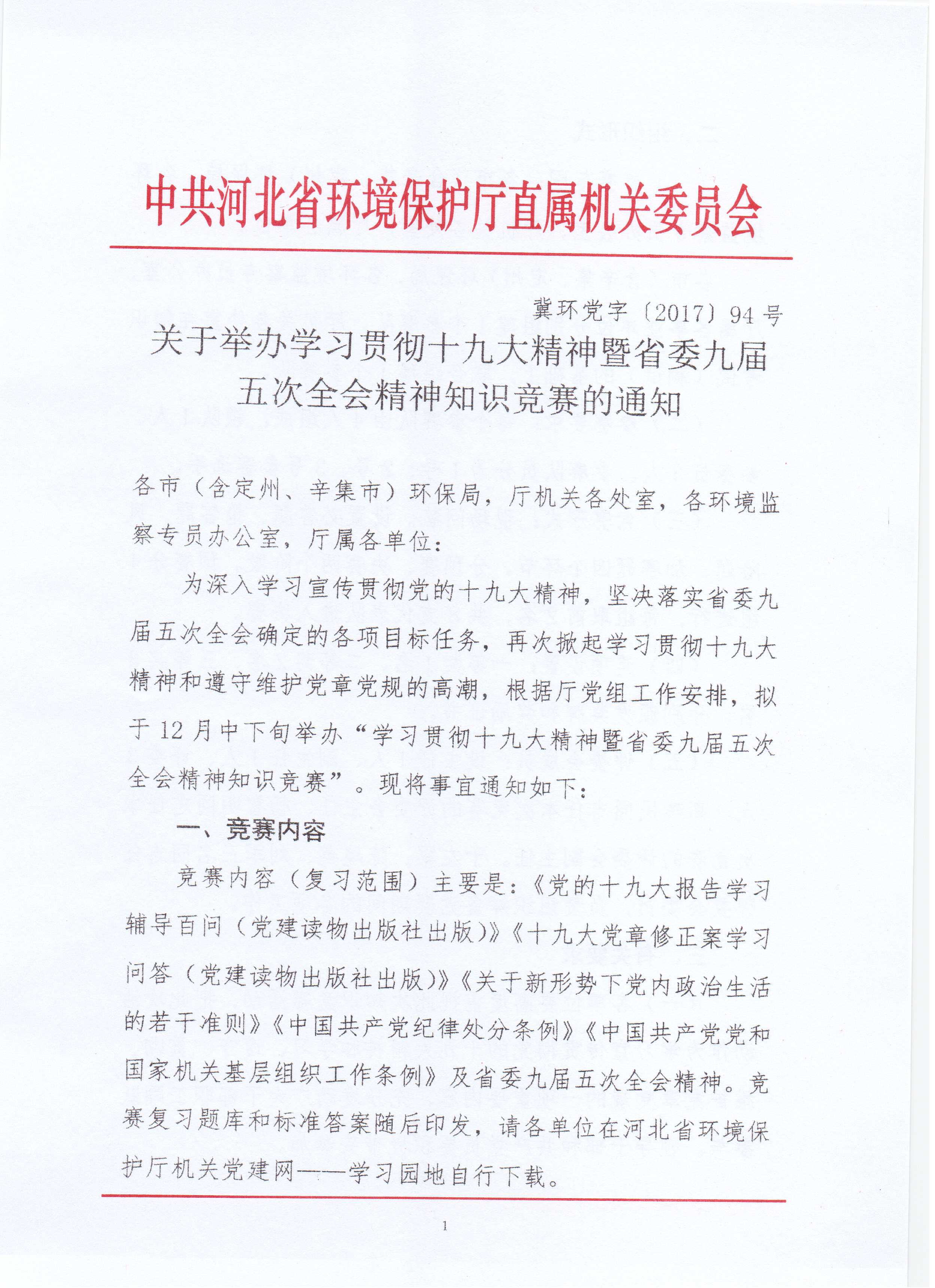 关于举办学习贯彻党的十九大精神暨省委九届五次全会精神知识竞赛的通知 冀环党字〔2017〕94号 来源: 时间:2017-11-27