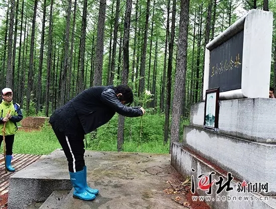 一位长春的游客听完导游讲述王尚海的故事后,在王尚海纪念林碑前鞠躬献花,表达崇敬之情。 记者贾恒 霍艳恩摄