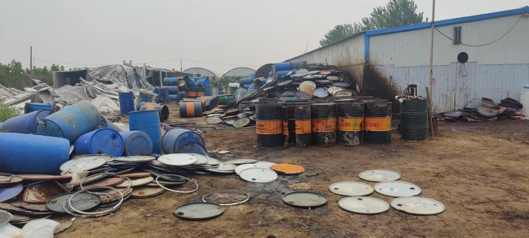 2022年6月14日,沧州市生态环境局南皮县分局接到南皮县公安局电话通知,称掌握一个非法处置危险废物线索,南皮县公安局联合沧州市生态环境局南皮县分局赴现场进行调查。联合检查时,南皮县姜强劈桶加工点未生产,现场有铁桶140个,塑料桶280个;成品铁皮三捆,共360张,经称重4362公斤,油劈完尚未压平铁桶皮72张;现场有加工机械劈桶机1台,压平机1台。现场有刺鼻性气味,地面有大量油污,部分土壤受到污染。河北中旭生态环境损害司法鉴定中心对现场地面油污及土壤进行采样监测,鉴定结果为HW08类危险废物,总重量约5吨。