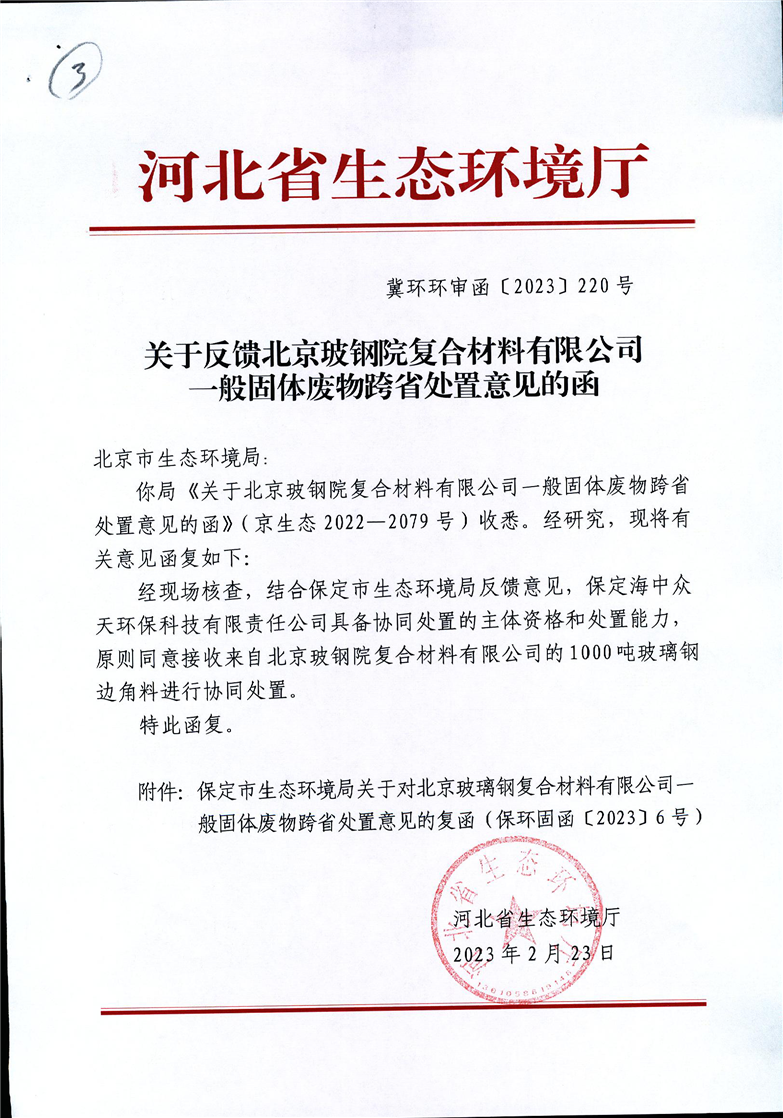 关于反馈北京玻钢院复合材料有限公司一般固体废物跨省处置意见的函