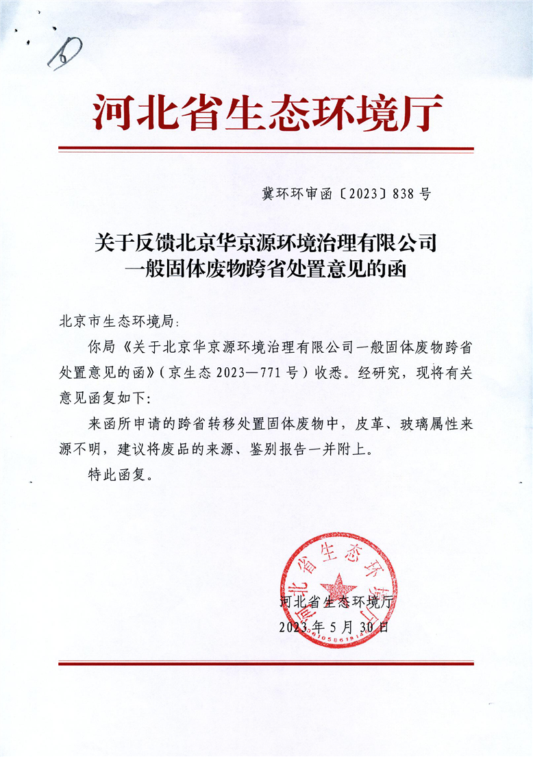 关于反馈北京华京源环境治理有限公司一般固体废物跨省处置意见的函