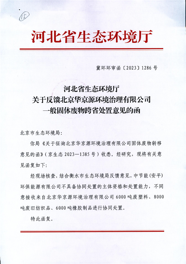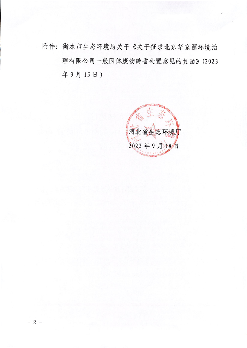 关于反馈北京华京源环境治理有限公司一般固体废物跨省处置意见的函