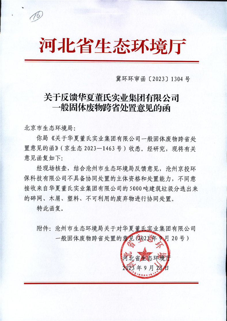 关于反馈北京华夏董氏实业集团有限公司一般固体废物跨省处置意见的函