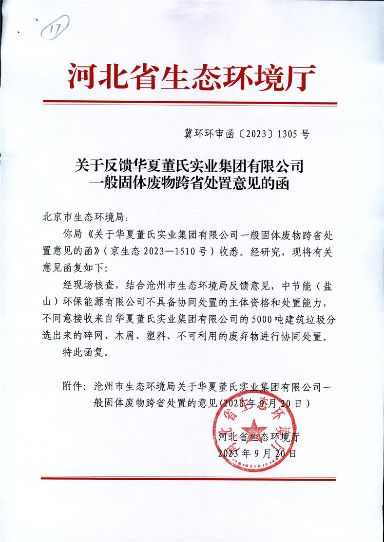 关于反馈北京华夏董氏实业集团有限公司一般固体废物跨省处置意见的函