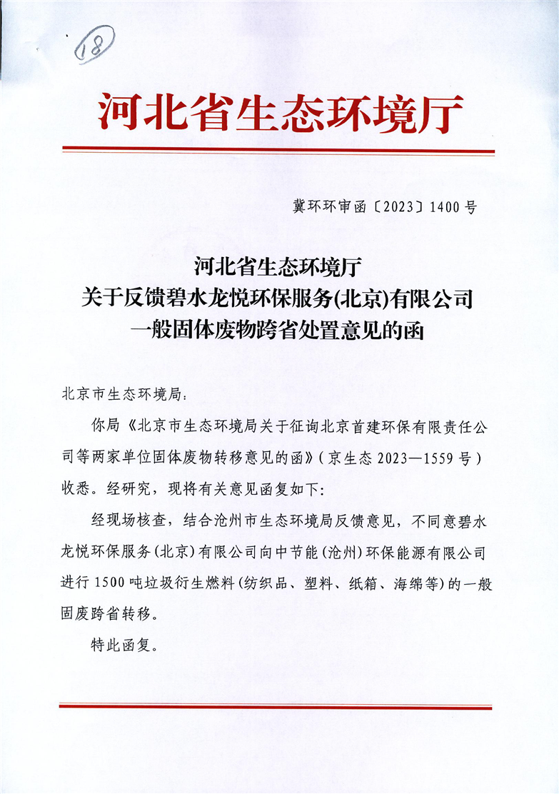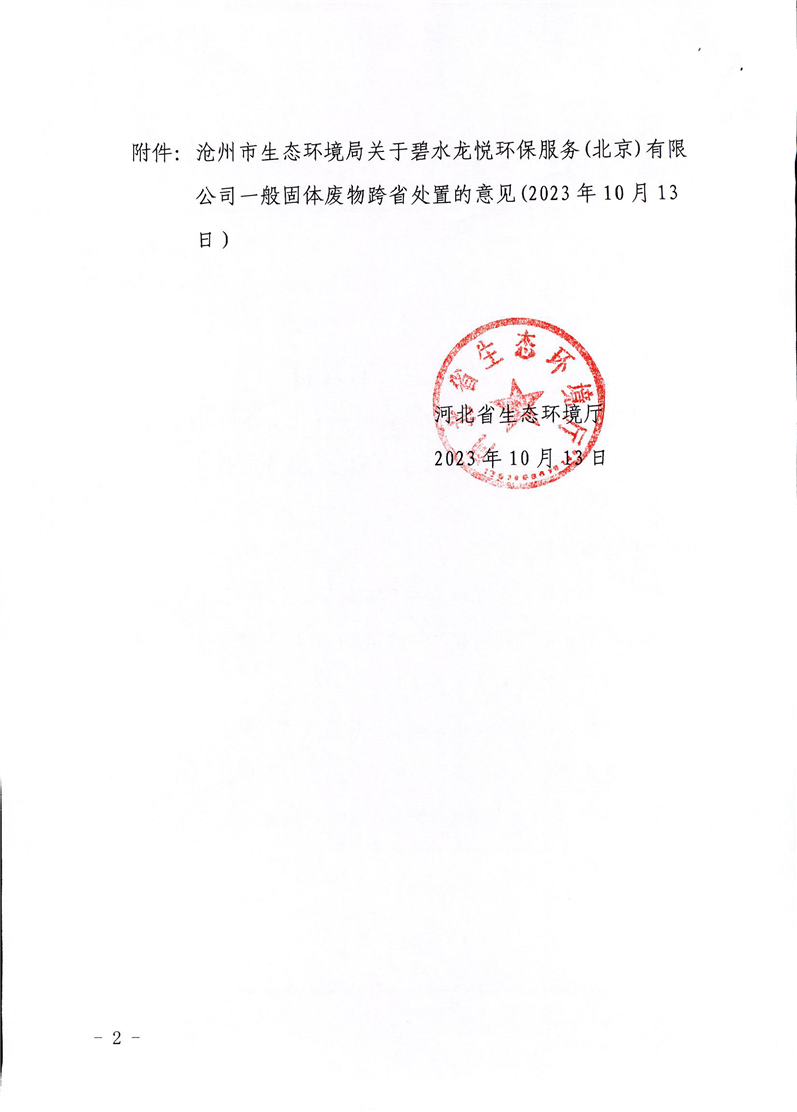 关于反馈碧水龙悦环保服务(北京)有限公司一般固体废物跨省处置意见的函