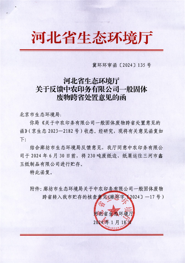 关于反馈中农印务有限公司一般固体废物跨省处置意见的函