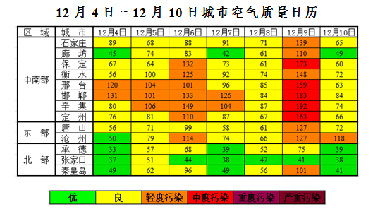 上周(12月4日~12月10日),我省北部空气质量以优良为主,东部以良为主,中南部以良至轻度污染为主。12月9日,保定、邢台、邯郸、辛集、定州出现1天中度污染,首要污染物以PM2.5或PM10为主。