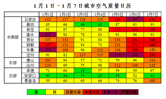 上周(2018年1月1日~1月7日),我省北部以优良为主,东部以良至轻度污染为主,中南部以良至轻度污染为主。其中,中南部1日、5日至7日出现了中度至重度污染,定州出现2天重度污染,石家庄、衡水、辛集各出现1天重度污染,首要污染物以PM2.5为主。