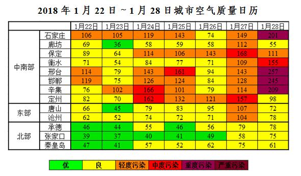 上周(122日~128日),我省北部和东部以优良为主,中南部以良至轻度污染为主。其中,28日中南部空气质量较差,石家庄、邢台、邯郸、辛集4市出现重度污染,首要污染物以PM2.5为主。
