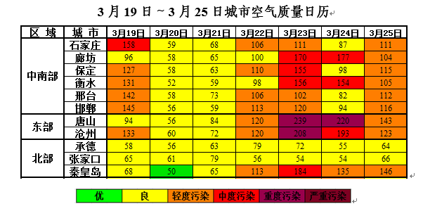 上周(2018319日~325日),323 -24日北部和南部以良至轻度污染为主,中东部以中至重度污染为主;其余时段全省以良至轻度污染为主。其中唐山2天、沧州1天重度污染,首要污染物以PM2.5为主。