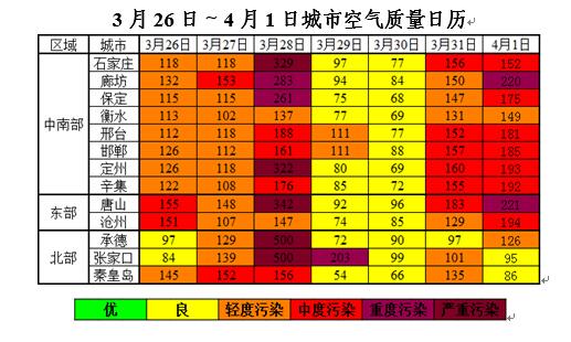 上周(2018年3月26日~4月1日),3月26日-27日,全省空气质量以轻度污染为主;29日-30日,全省以良为主;31日-4月1日,我省北部地区以良至轻度污染为主,东部和中南部地区以轻度至中度污染为主;3月28日,受沙尘天气影响,我省大部分地区以重度至严重污染为主,承德、张家口AQI达到500。